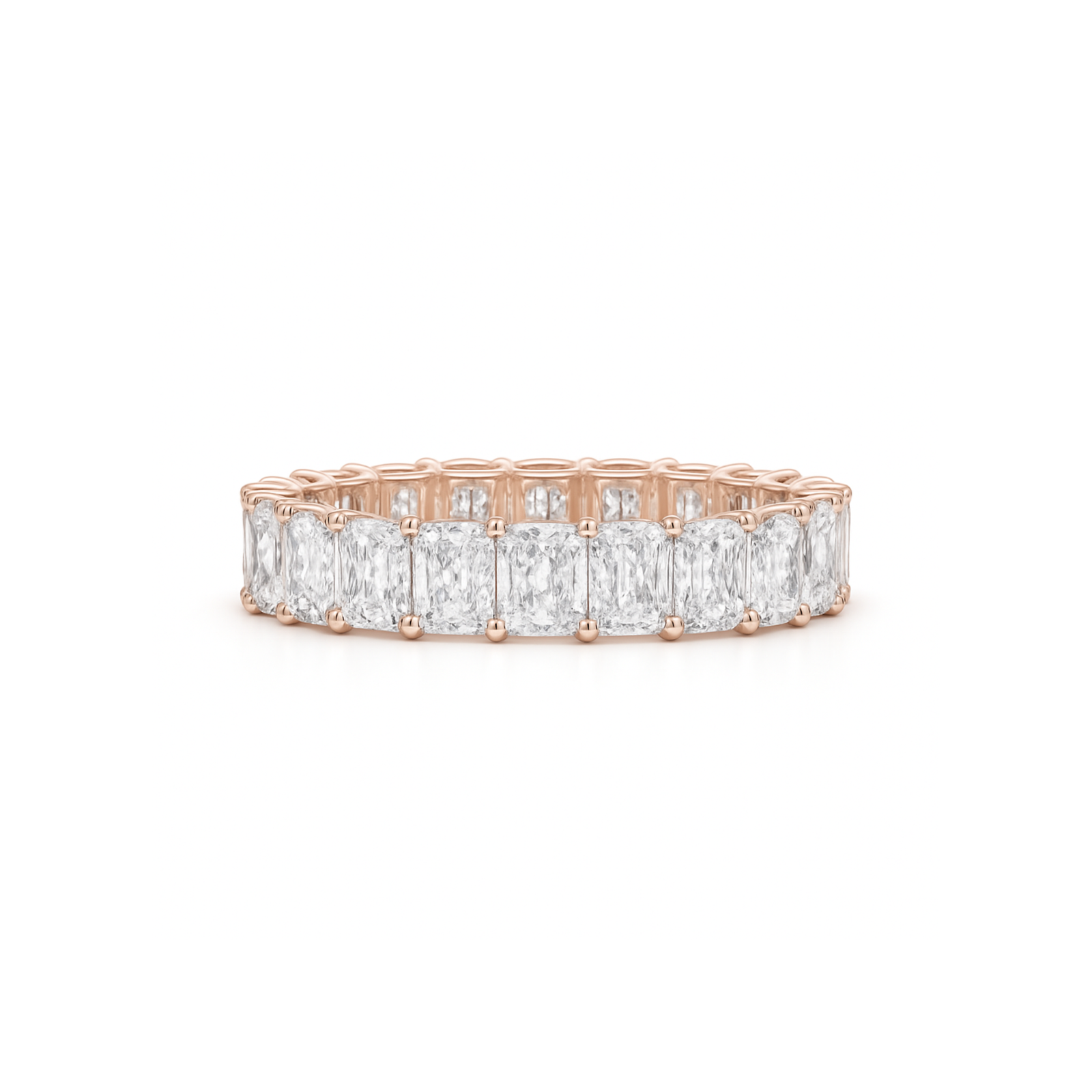 The Radiant Full Eternity Band features radiant-cut lab-grown diamonds of DEF color and VVS clarity, ~0.40 ct each, set all around the band. Handcrafted in certified 18kt gold, it symbolizes infinite love and Medici refinement.