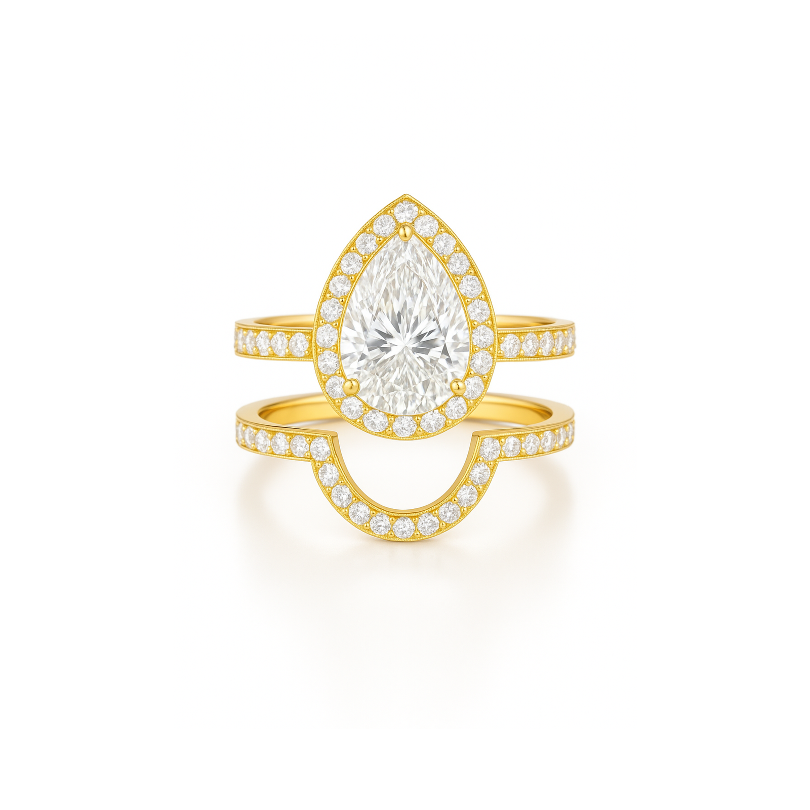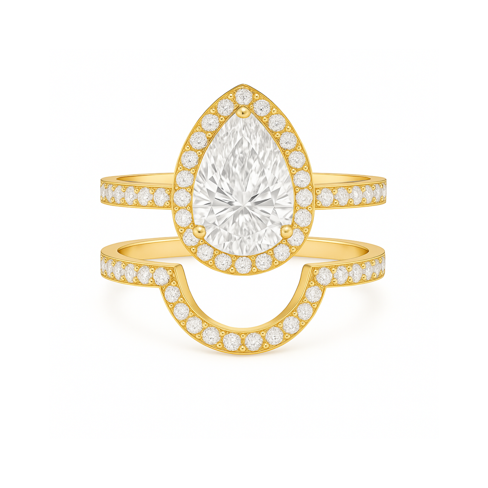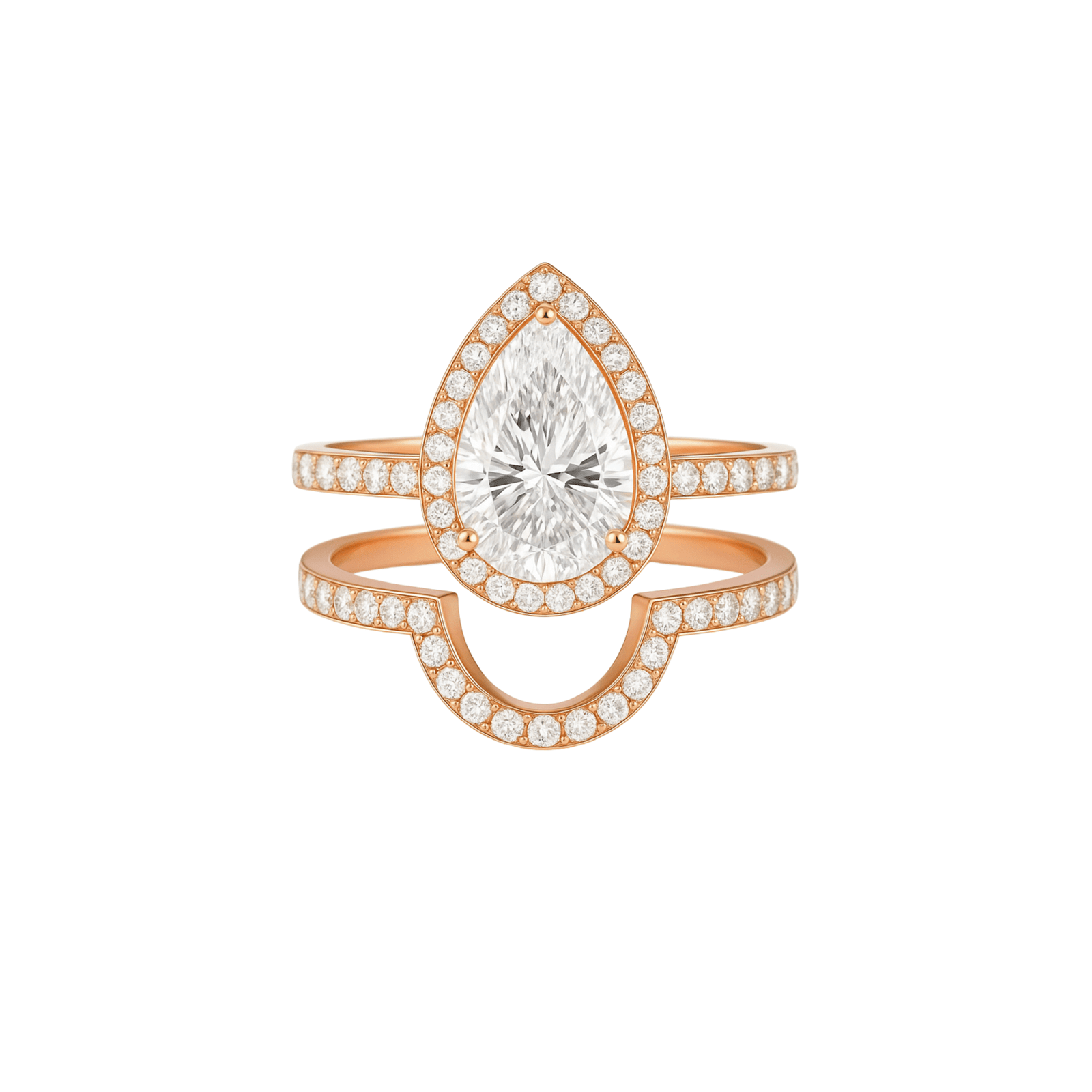 The Giulia with a Twin features a 1.5 or 2.0 ct pear-cut lab-grown diamond, graded E or F color and VVS1 clarity. A pavé halo and matching twin band create a seamless, radiant bridal set, handcrafted in certified 18kt gold.