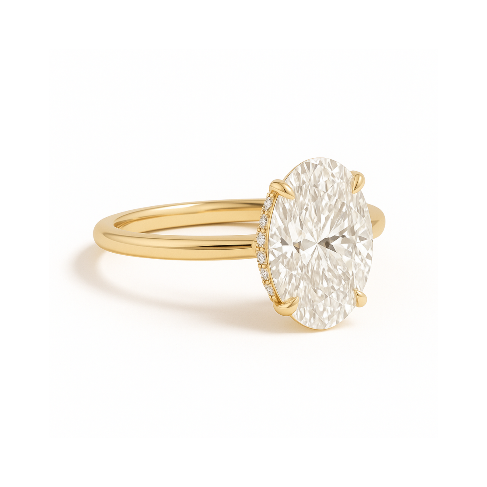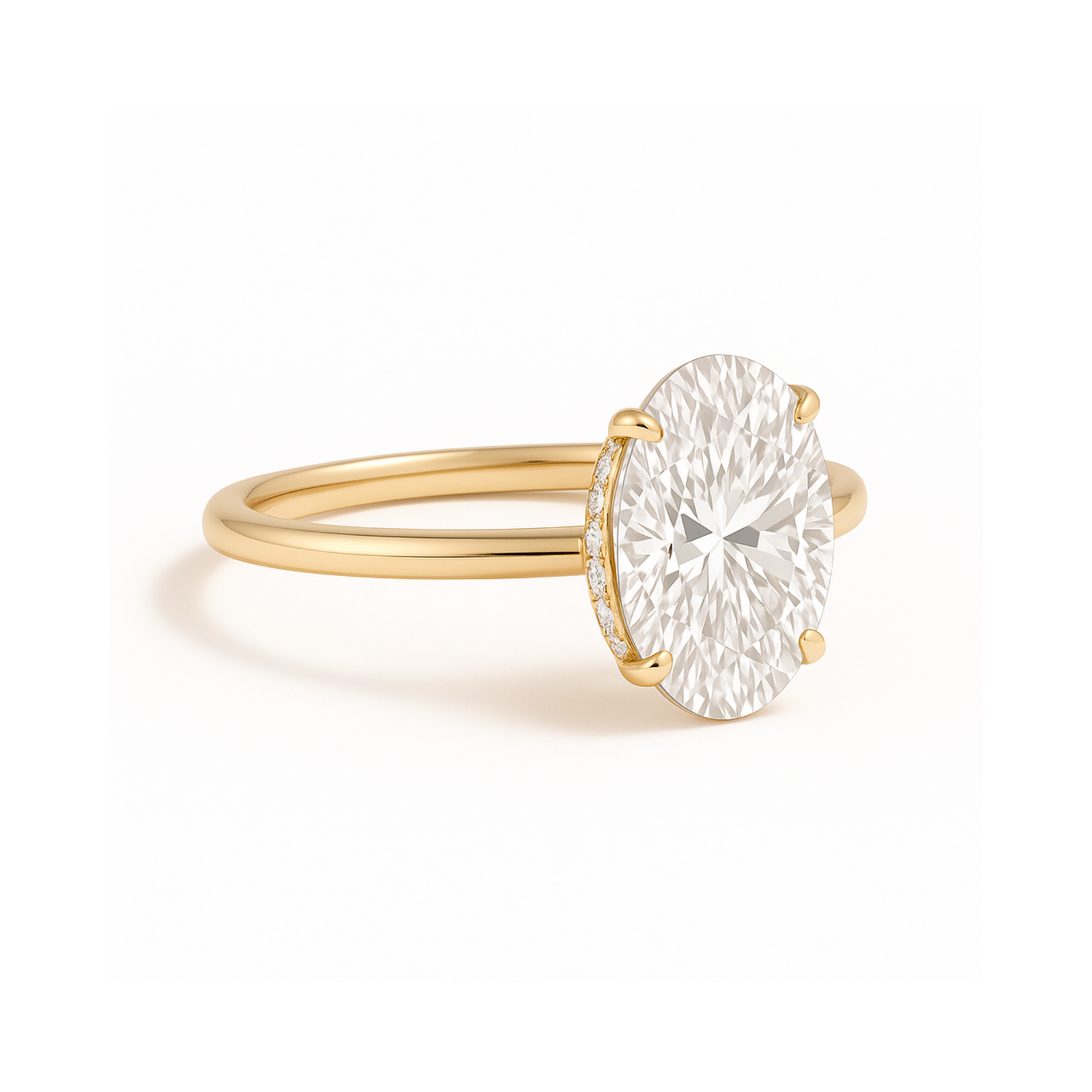 The Hailey 2.0 Ring features a 1,5 or 2.0 ct oval lab-grown diamond, graded E or F color and VVS clarity. A discreet 1.3 mm hidden halo enhances its brilliance, handcrafted in certified 18kt gold.
