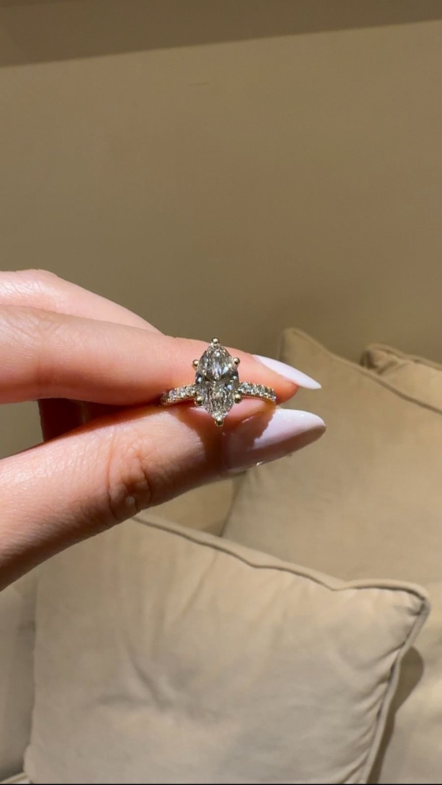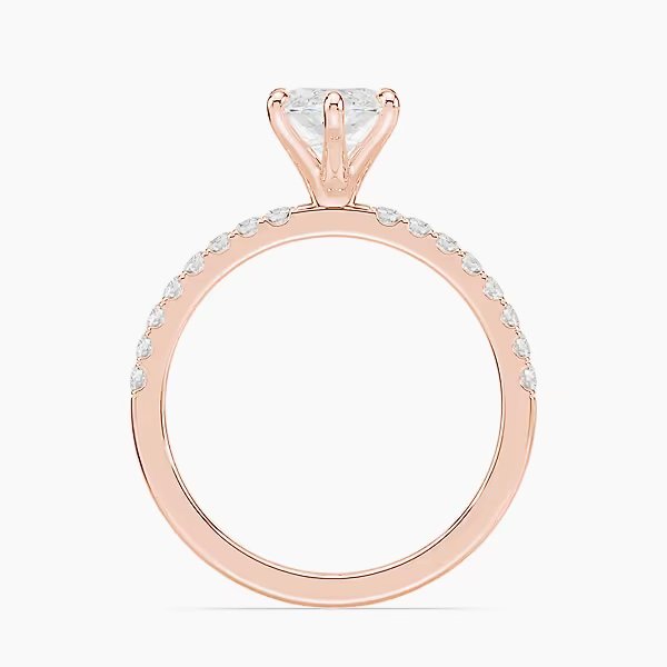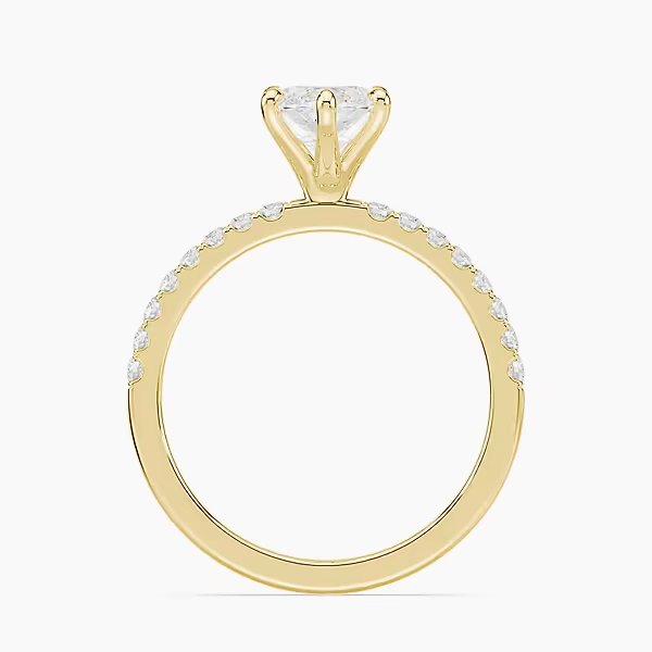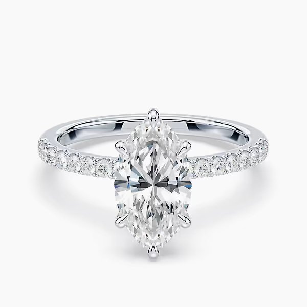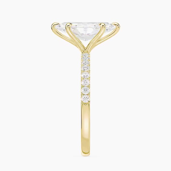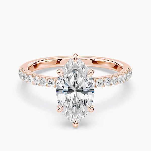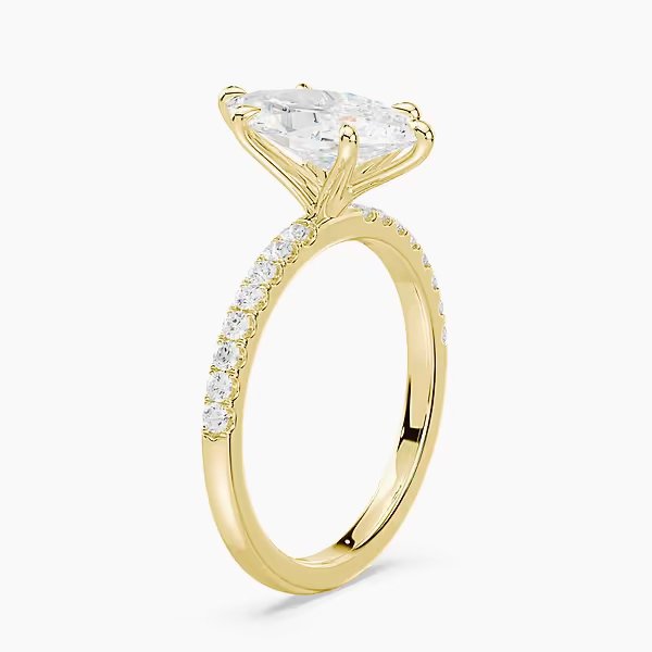 The Selena Pavé Ring features a 2.0 ct lab-grown marquise diamond, graded E or F color and VVS clarity. A pavé band enhances its brilliance, handcrafted in certified 18kt gold.