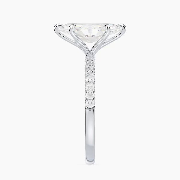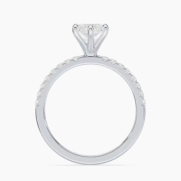 The diamond is set on a refined pavé band, delicately handcrafted with shimmering accent stones that enhance the centerpiece’s sparkle from every angle. A design that combines elegance and modern refinement, it is the perfect choice for engagements and meaningful milestones.