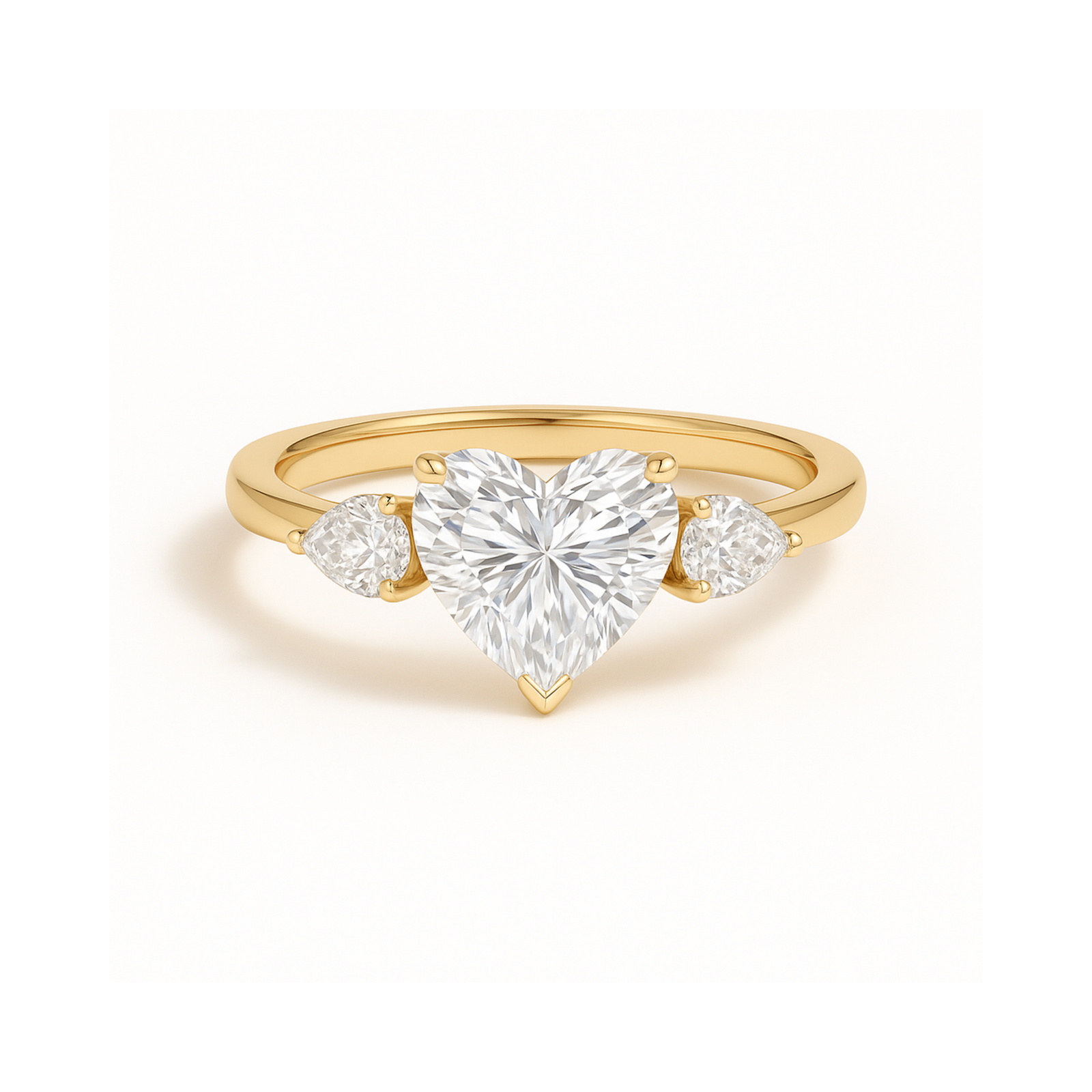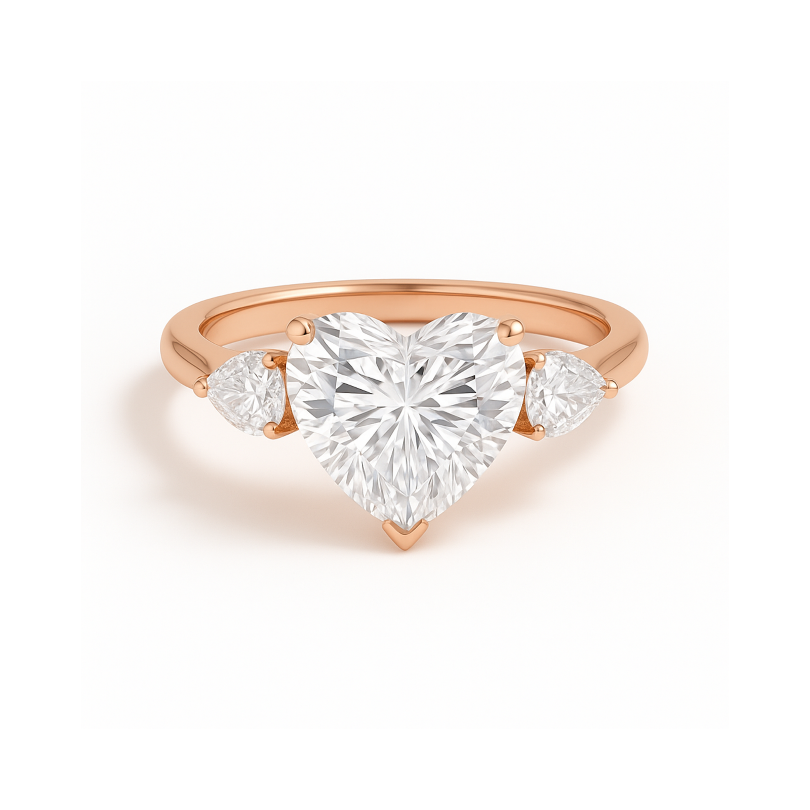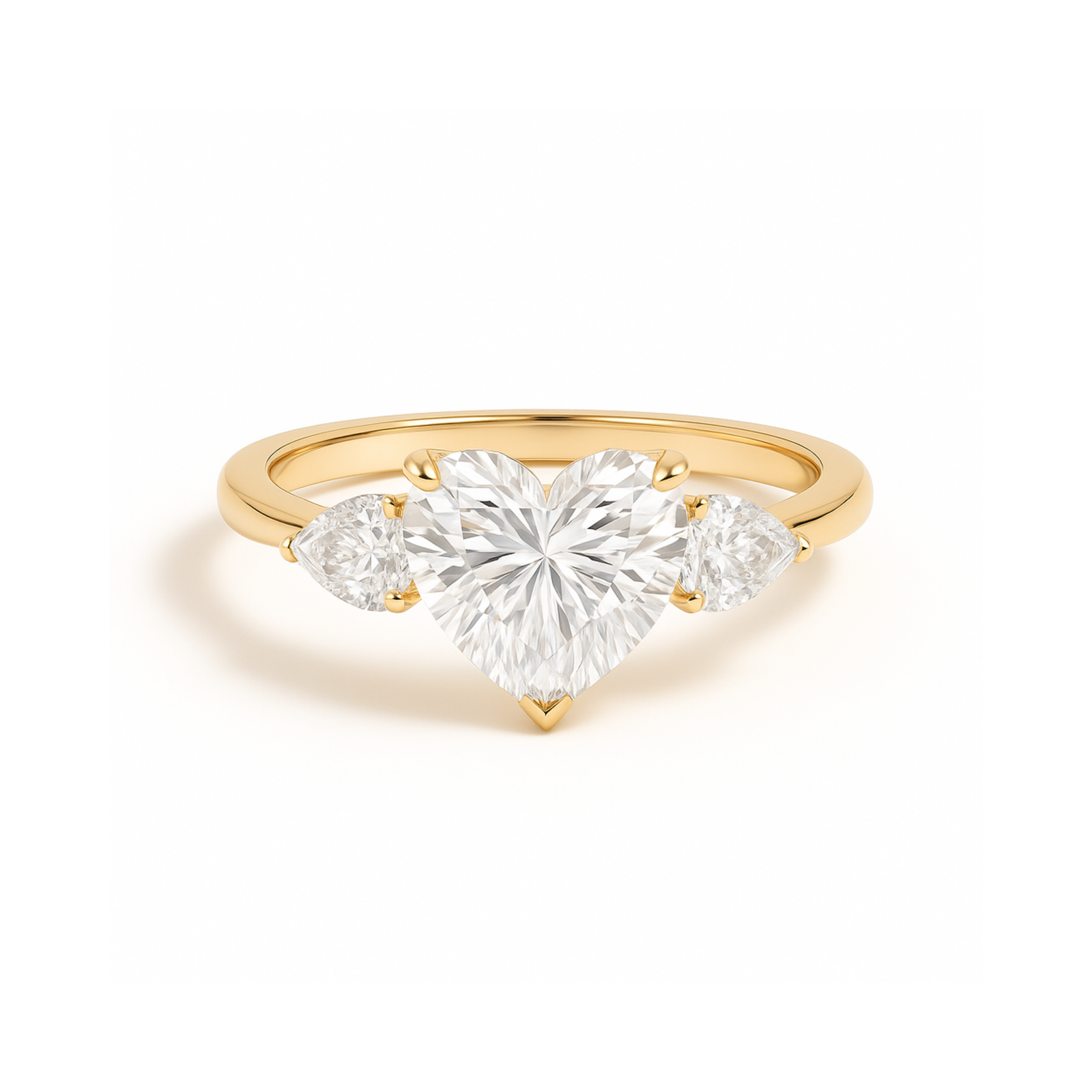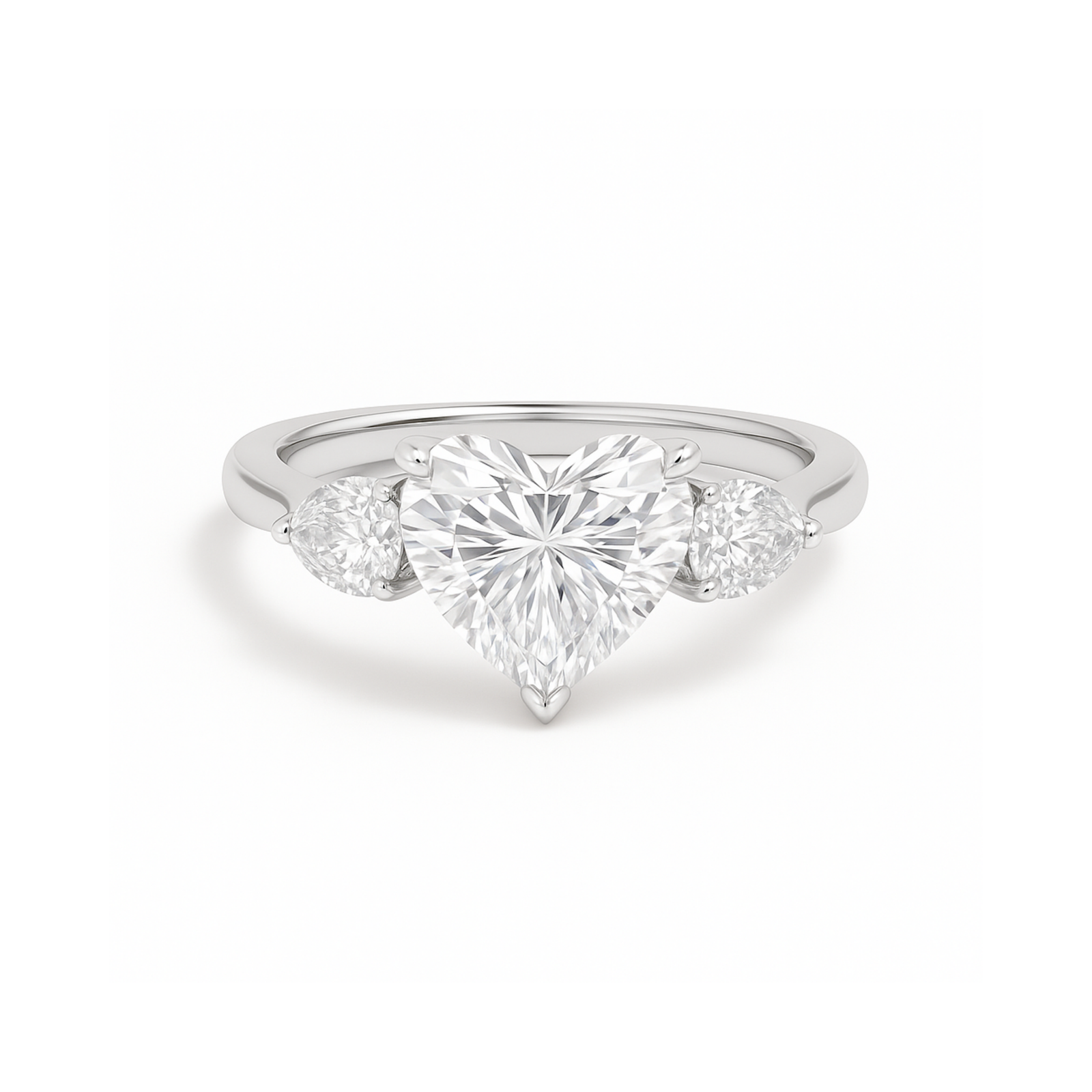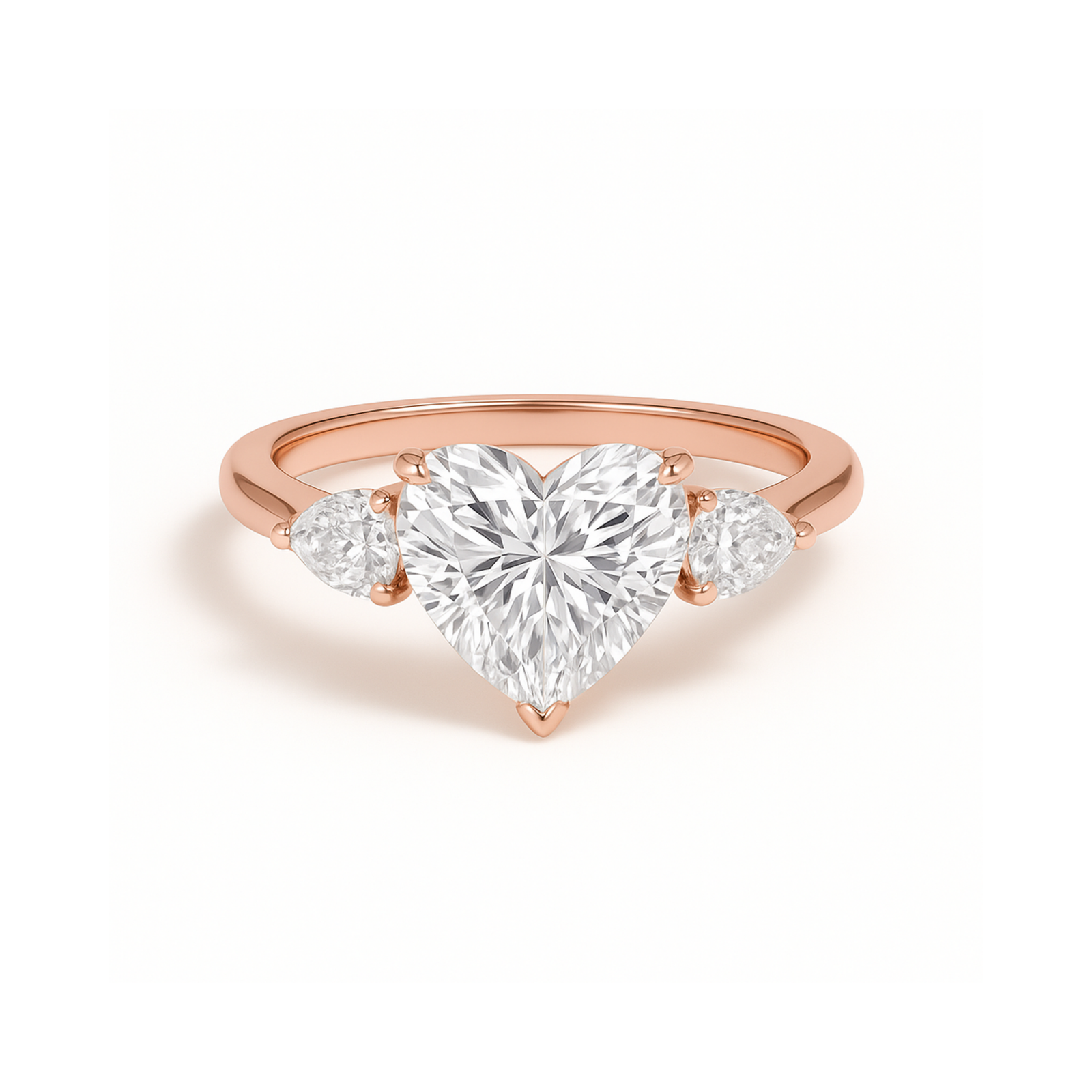 On either side, 0.25 or 0.30 or 0.40 ct pear-cut lab-grown diamonds DEF color, VVS clarity complete the composition, forming a refined three-stone silhouette that balances bold presence with graceful symmetry. This arrangement enhances sparkle from every angle while symbolizing love, harmony, and timeless devotion.