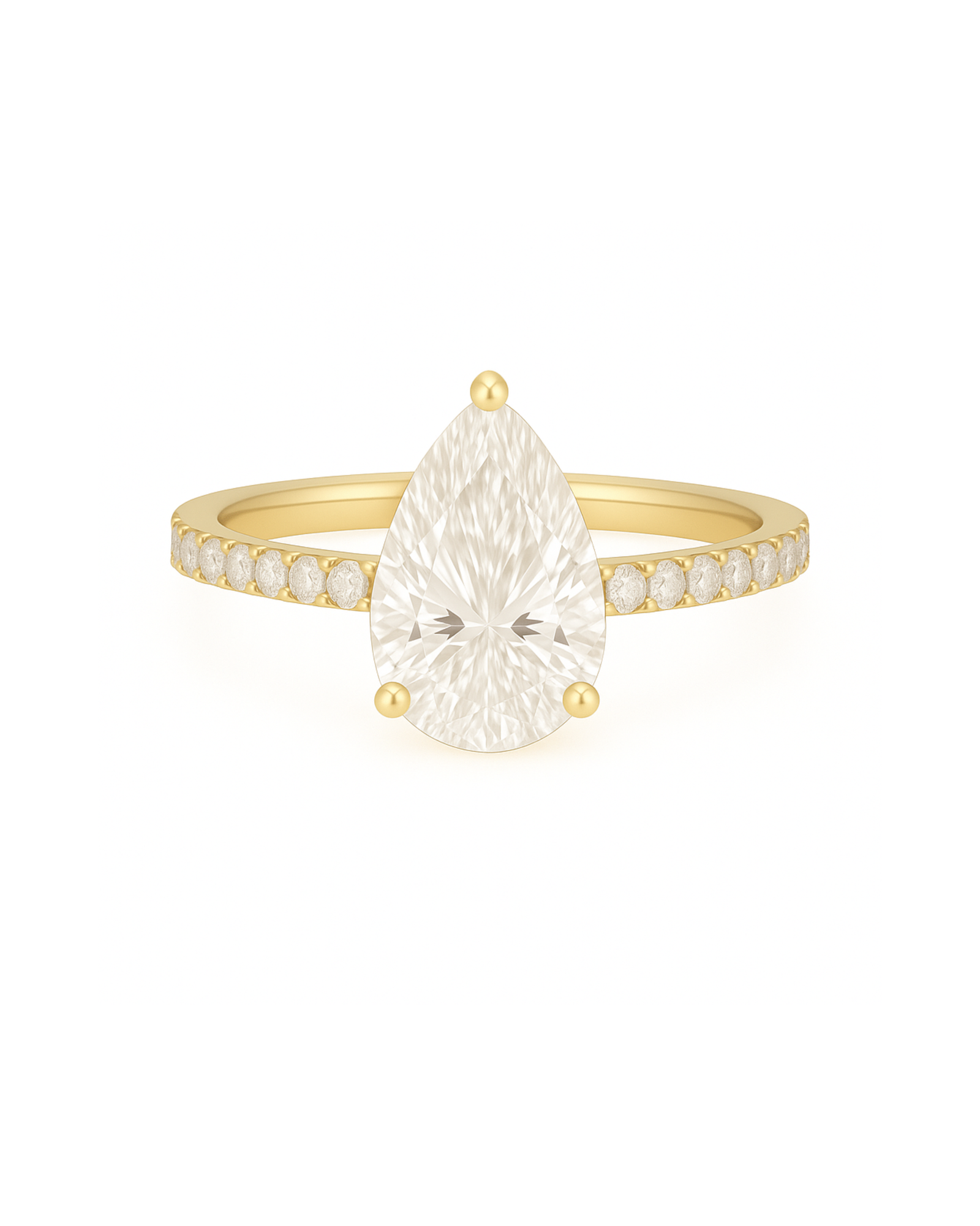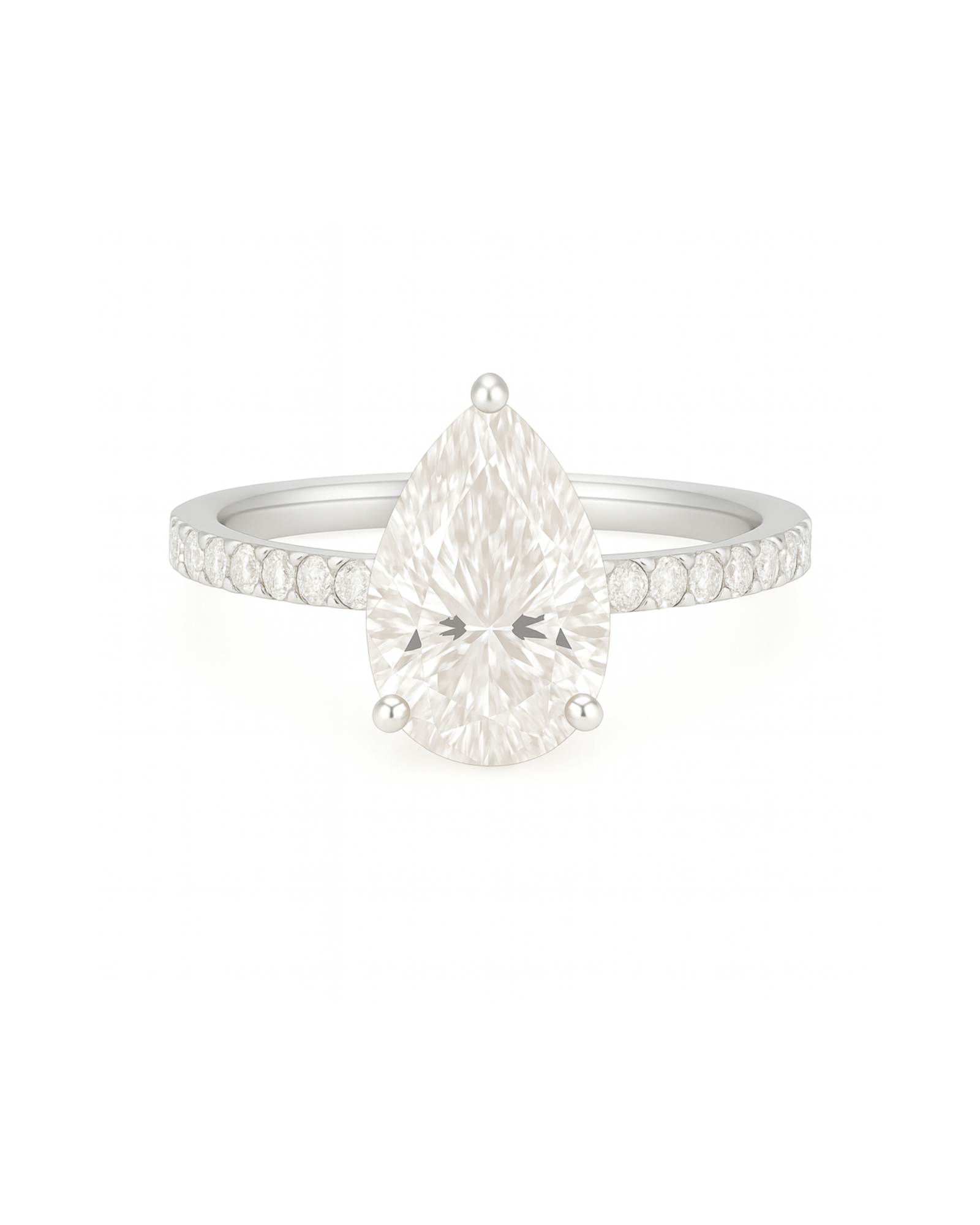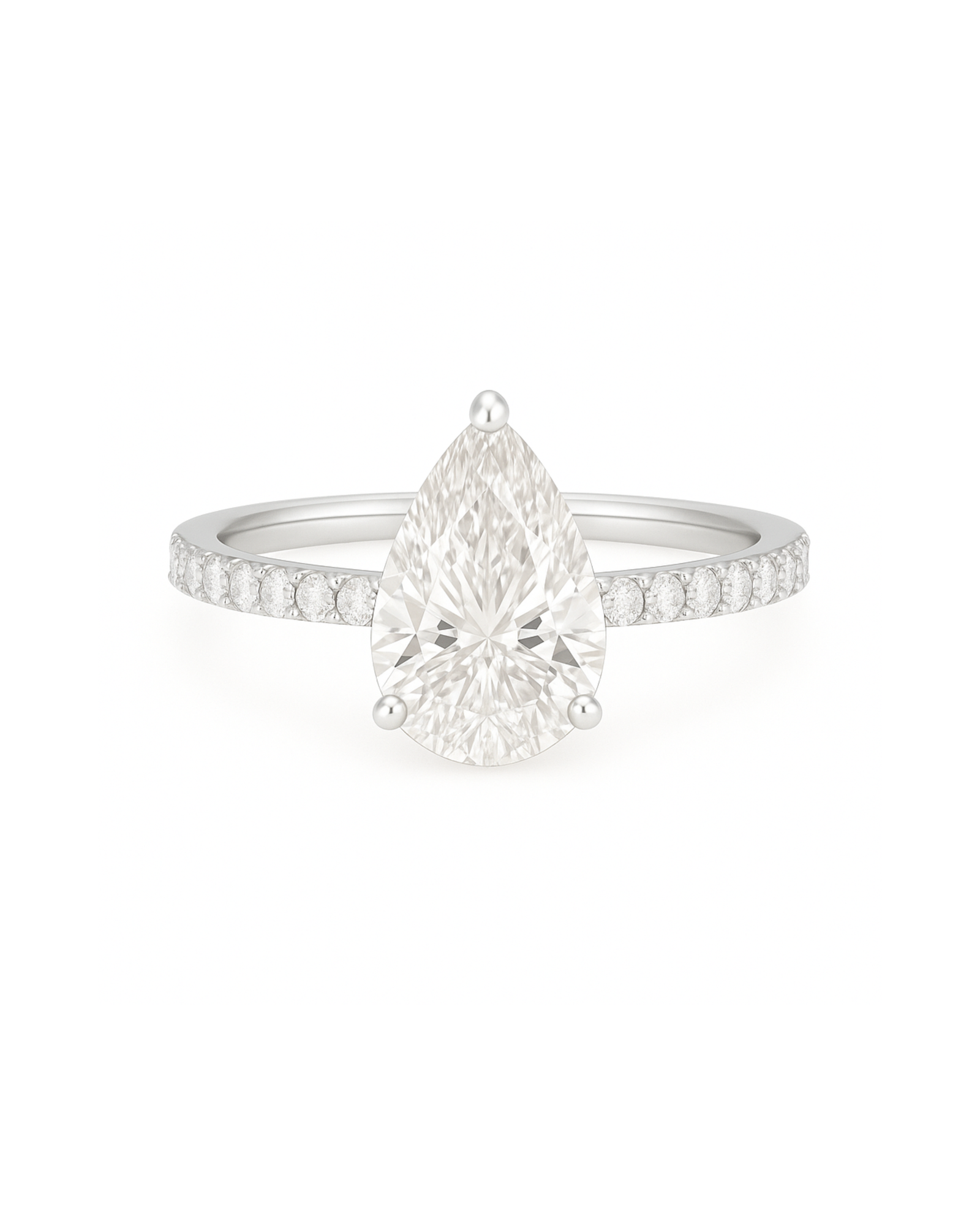 The Vittoria Ring features a 1.5 or 2.0 ct pear brilliant lab-grown diamond, graded E or F color and VVS clarity. A pavé band adds refined sparkle, handcrafted in certified 18kt gold.