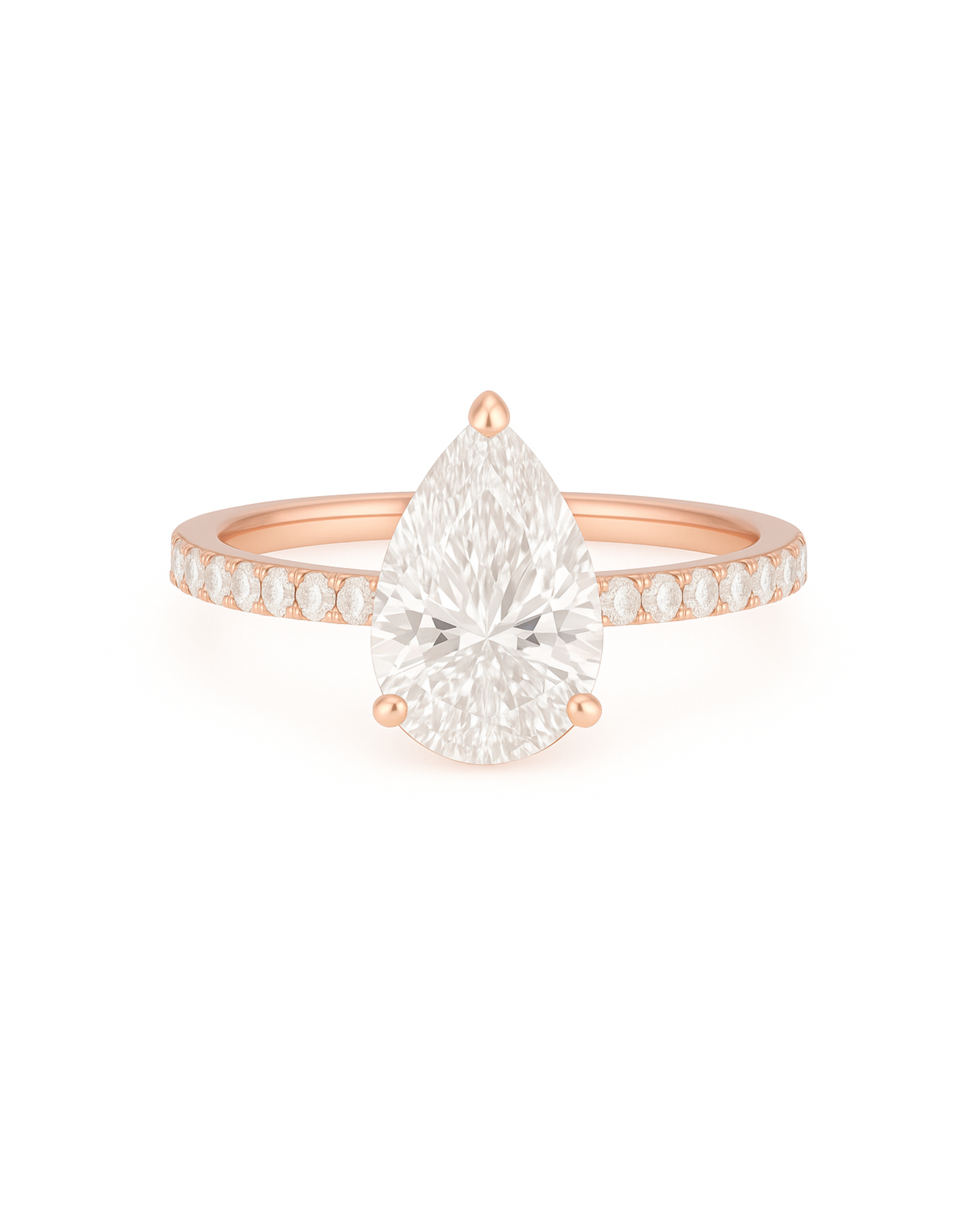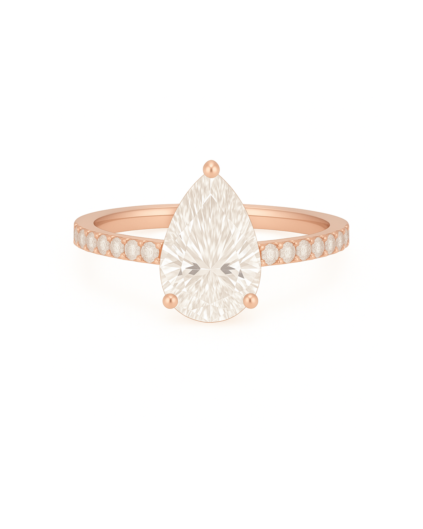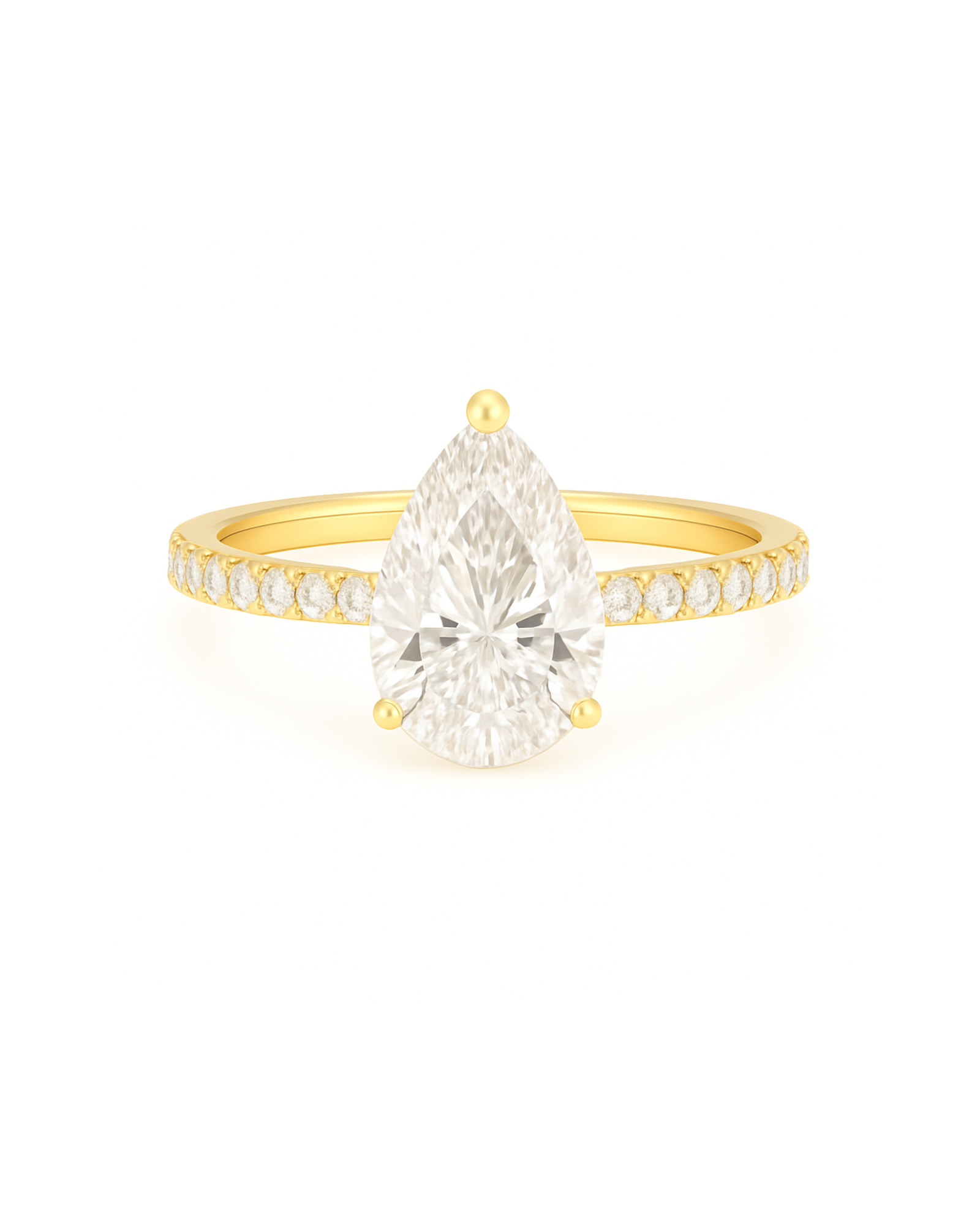 The Vittoria Ring features a 1.5 or 2.0 ct pear brilliant lab-grown diamond, graded E or F color and VVS clarity. A pavé band adds refined sparkle, handcrafted in certified 18kt gold.